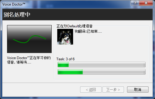 别名正在处理: Voice Doctor 正在使用你在最后页面录制的声纹处理别名列表中的所有语音别名。这会花费一些时间,因此向导会显示处理进度。你可以随时点击“取消"按钮停止处理。否则,向导会告知你何时结束。
