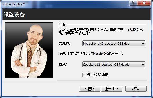设置设备页面: 选择与MorphVOX一同使用的麦克风和回放设备。